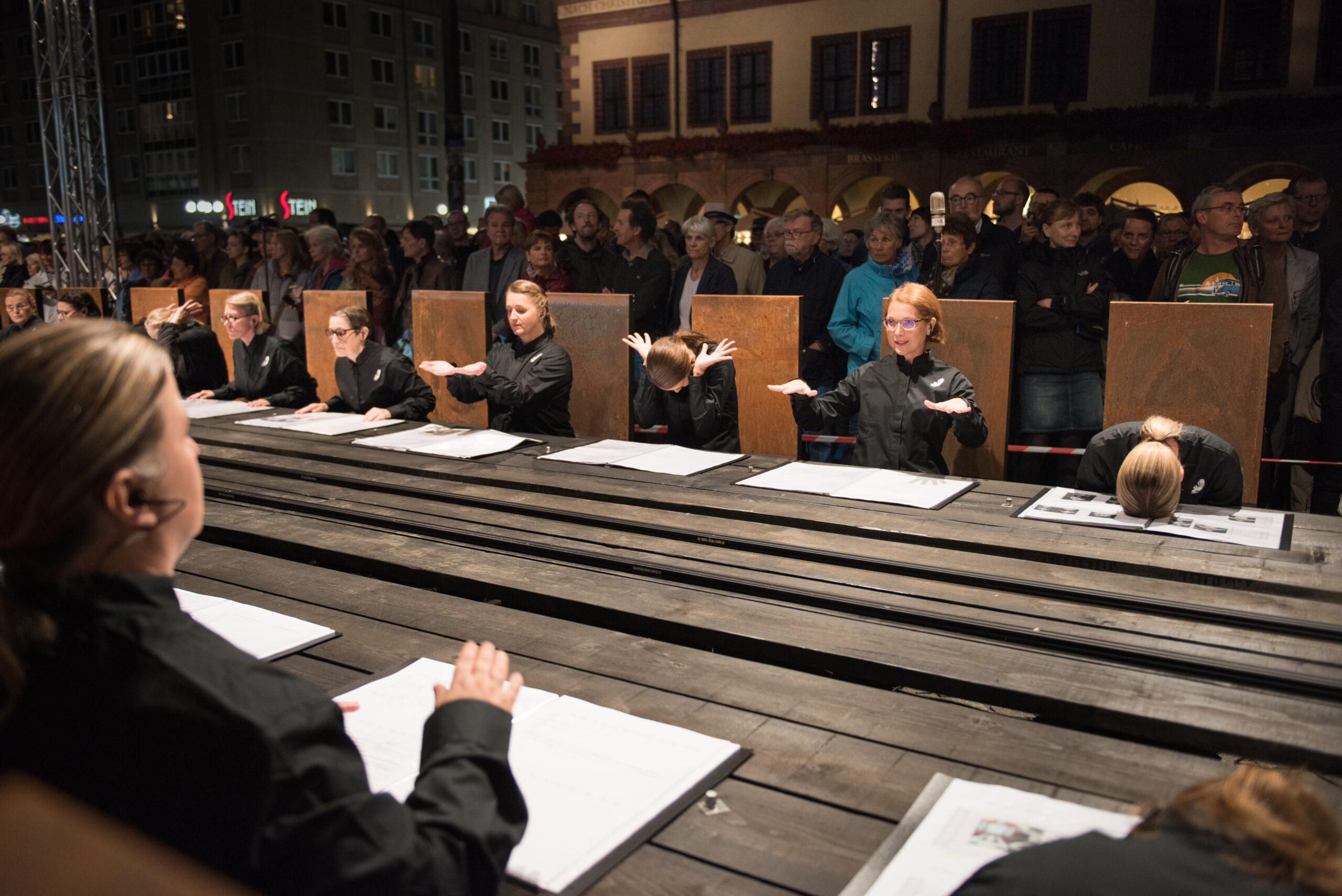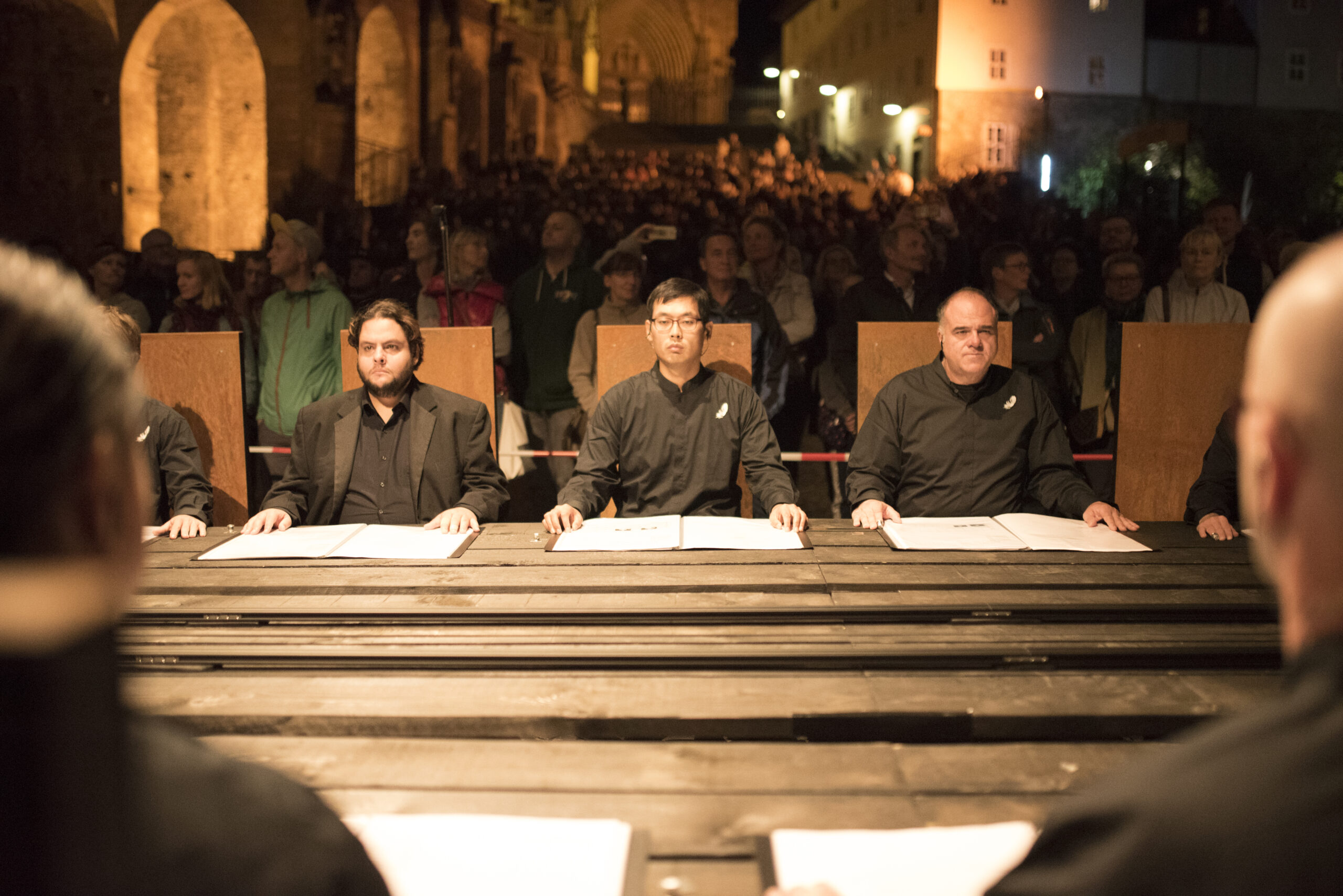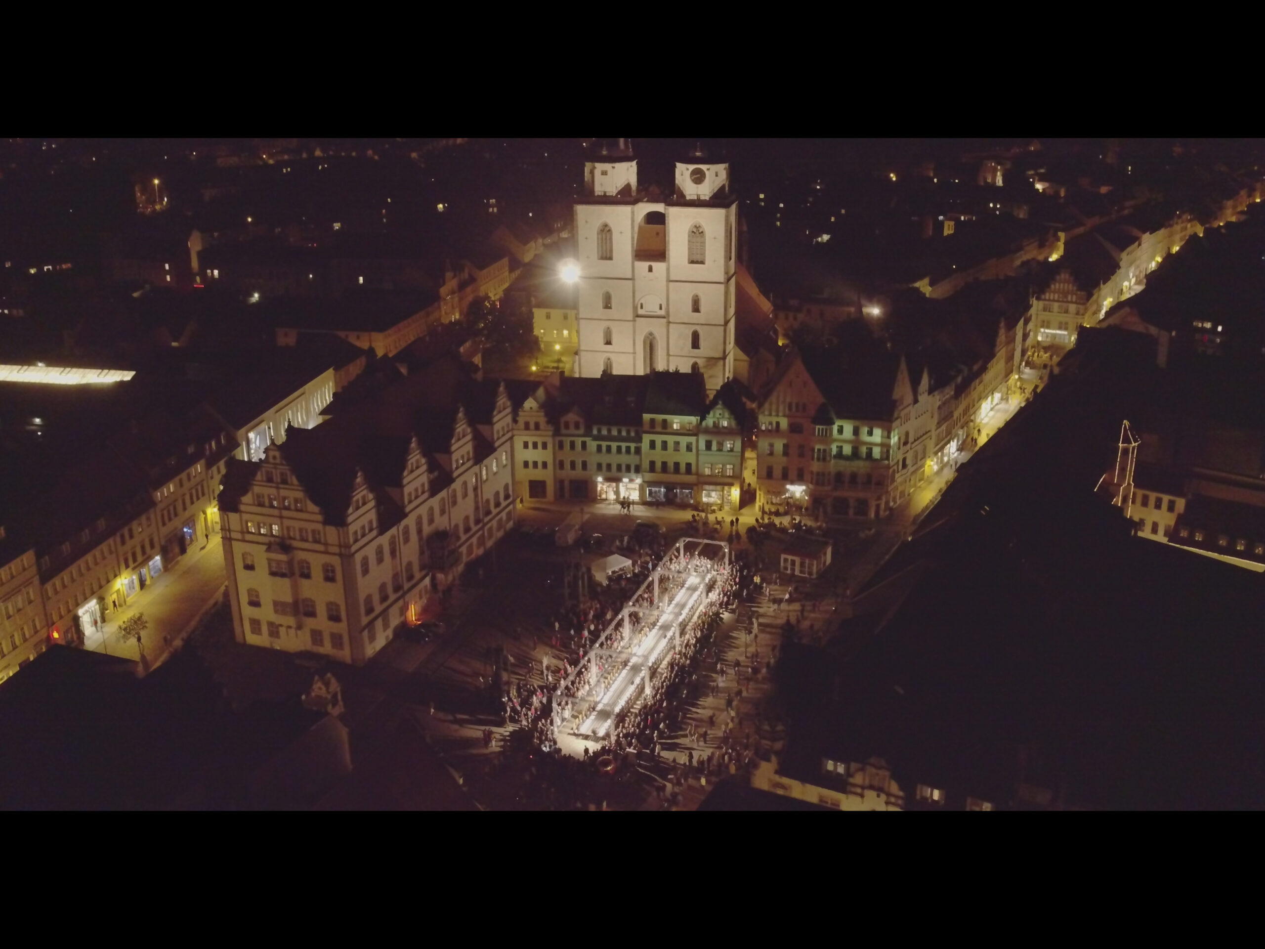 Die gab es auch in Wittenberg: die wunderbare Lichtinstallation vor der romantischen Altstadtkulisse zog bereits eine Stunde vor Beginn der Aufführung einige Hundert Besucher an. Am Ende waren es geschätzte 1 000. 95 Sängerinnen und Sänger vom Staatstheater Meiningen, darunter neun Solisten aus Dresden, boten den imposanten künstlerischen Rahmen. Die surreal anmutende Szenerie bot Raum für Interpretationen. Da waren Textpassagen, pantomimische Gesten in einer ausgeklügelten Choreografie zu erleben – sichtbar auf vier Videoleinwänden.