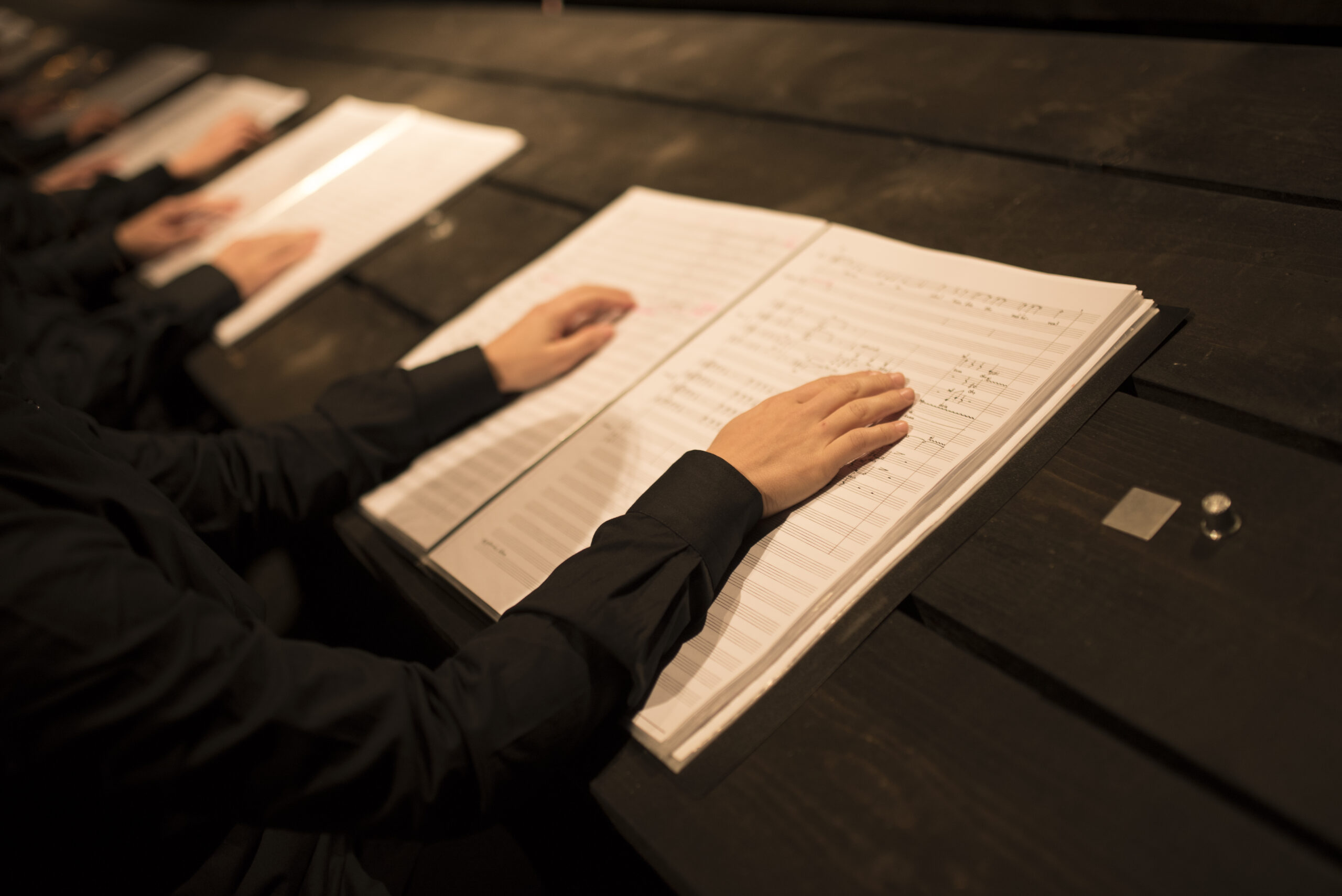 Die Mitwirkenden sind am Tisch verteilt [siehe Besetzungsansicht] und haben eine feste Position inkl. dazugehöriger Nummer. Diese spezielle Besetzung sollte bereits im Probenprozess berücksichtigt werden. Die Mitwirkenden spielen mit In-Ear-Monitoring. Dafür existiert ein mehrkanaliger Klicktrack mit Taktansage, der den verschiedenen Gruppen zugeordnet ist.