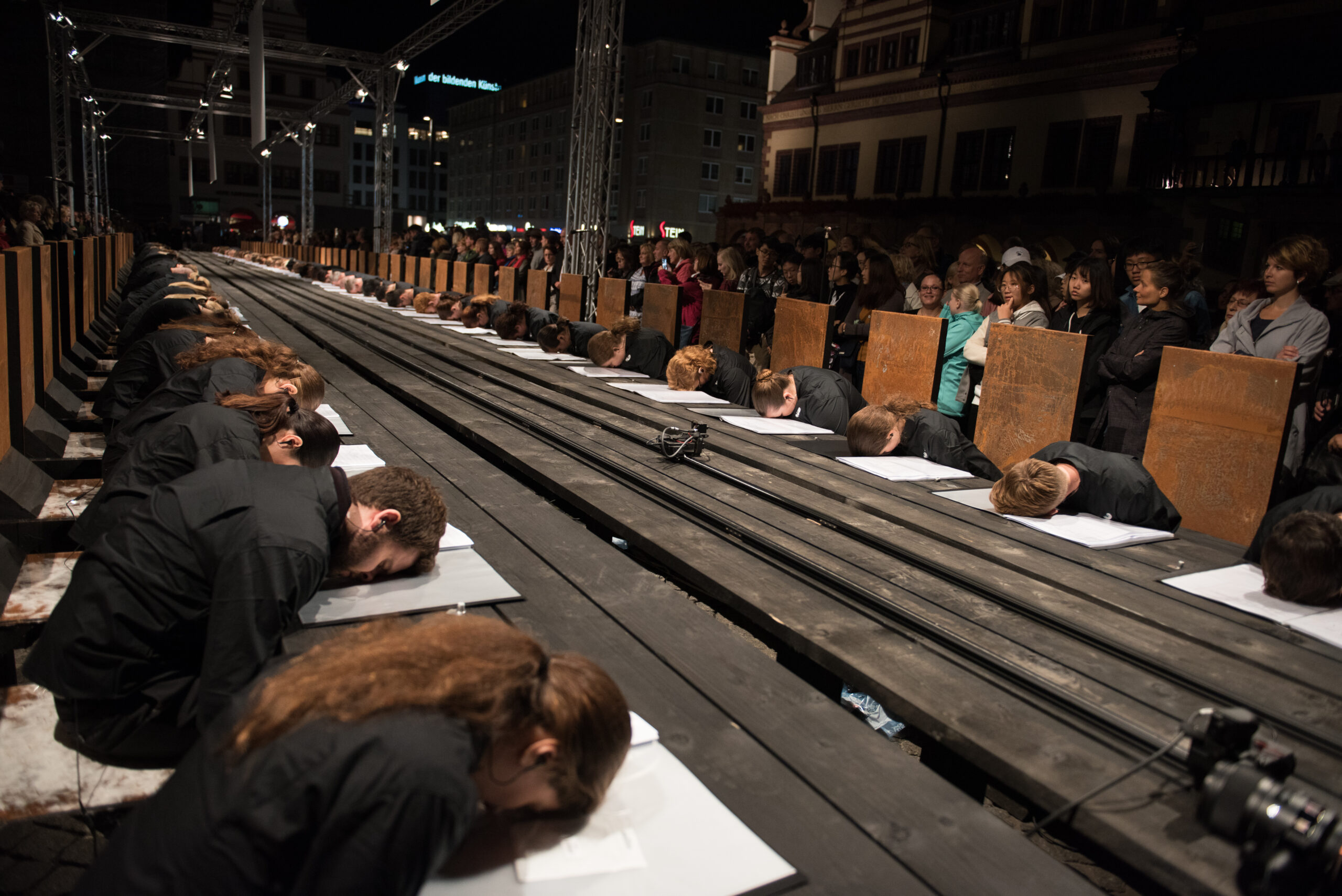 Konzertinstallation für Knaben- oder Mädchensopran, Solisten, Chöre, SprecherInnen, Videokameras und Licht an einer Tafel mit 95 Stühlen